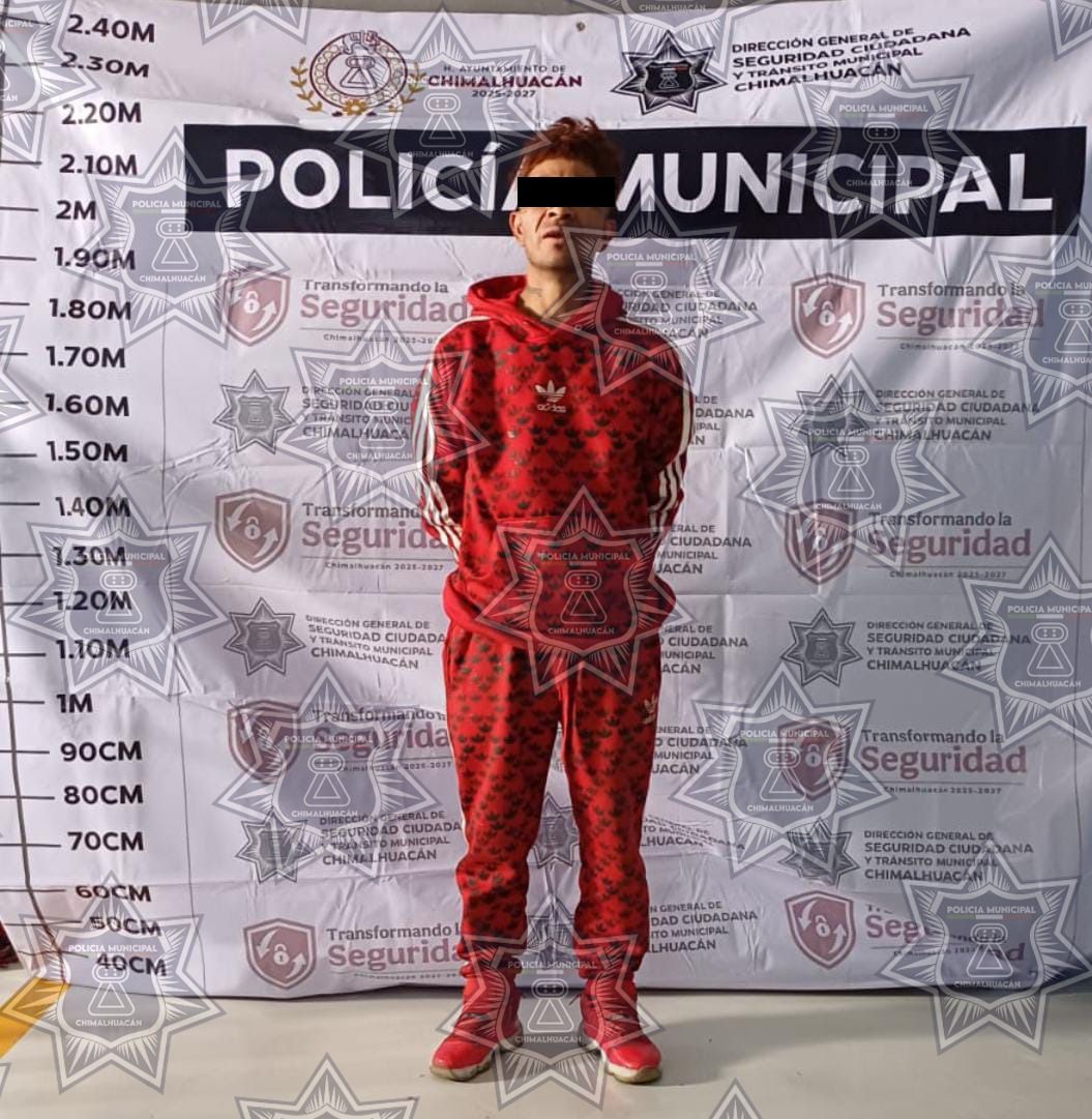 Chimalhuacán, México._Elementos de la policía municipal de Chimalhuacán detuvieron a un hombre señalado por su probable participación en diversos robos con violencia registrados en el municipio, luego de que autoridades iniciaron labores de investigación tras la difusión de un video en redes sociales donde se observa a dos sujetos despojando a una familia de su motoneta.