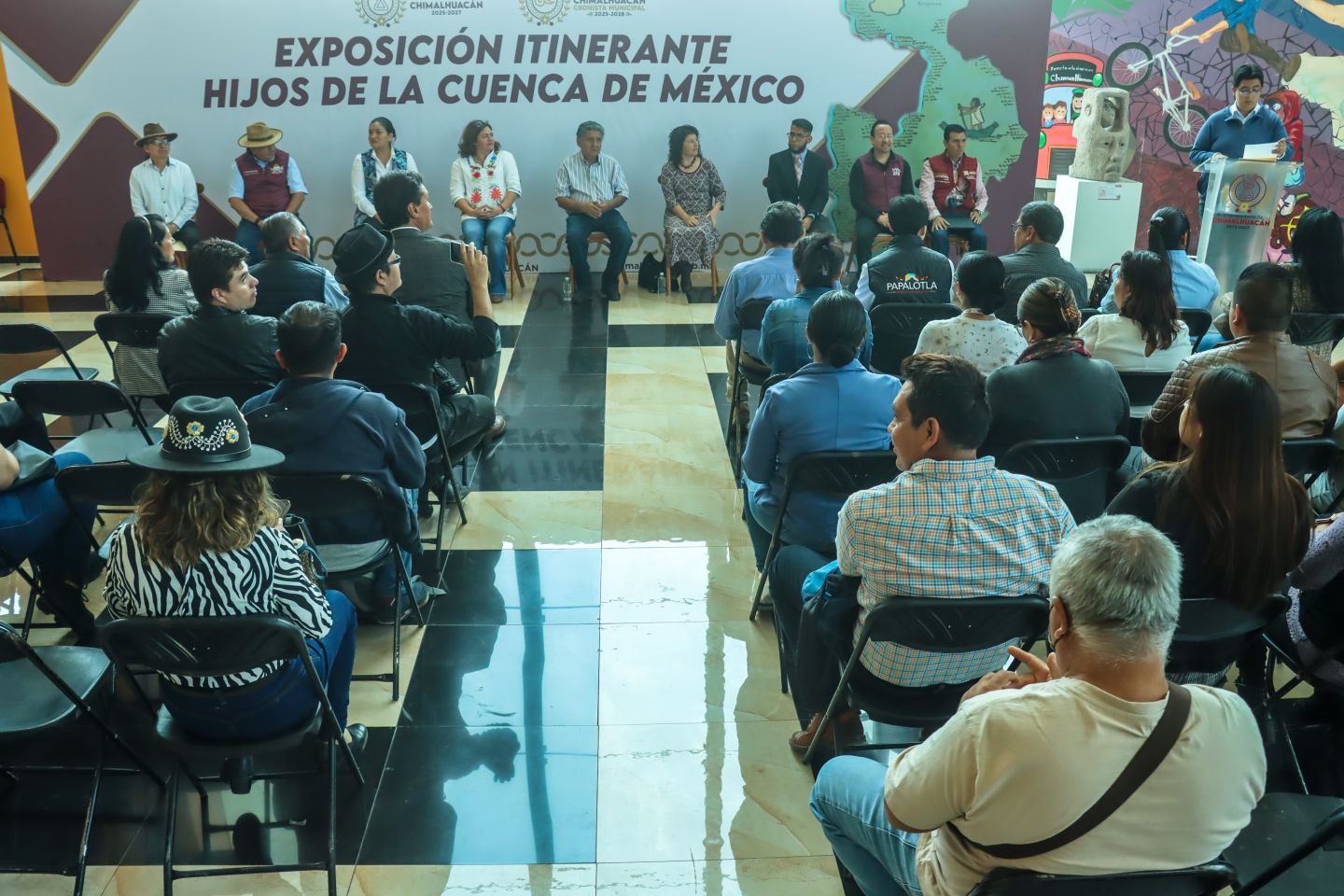 Chimalhuacán, México._Con el objetivo de visibilizar el trabajo que realizan cronistas del oriente del Estado de México y pueblos originarios de la Ciudad de México, el H. Ayuntamiento de Chimalhuacán inauguró la exposición itinerante ’Hijos de la Cuenca de México’ en las inmediaciones del Teatro Acolmiztli Nezahualcóyotl.