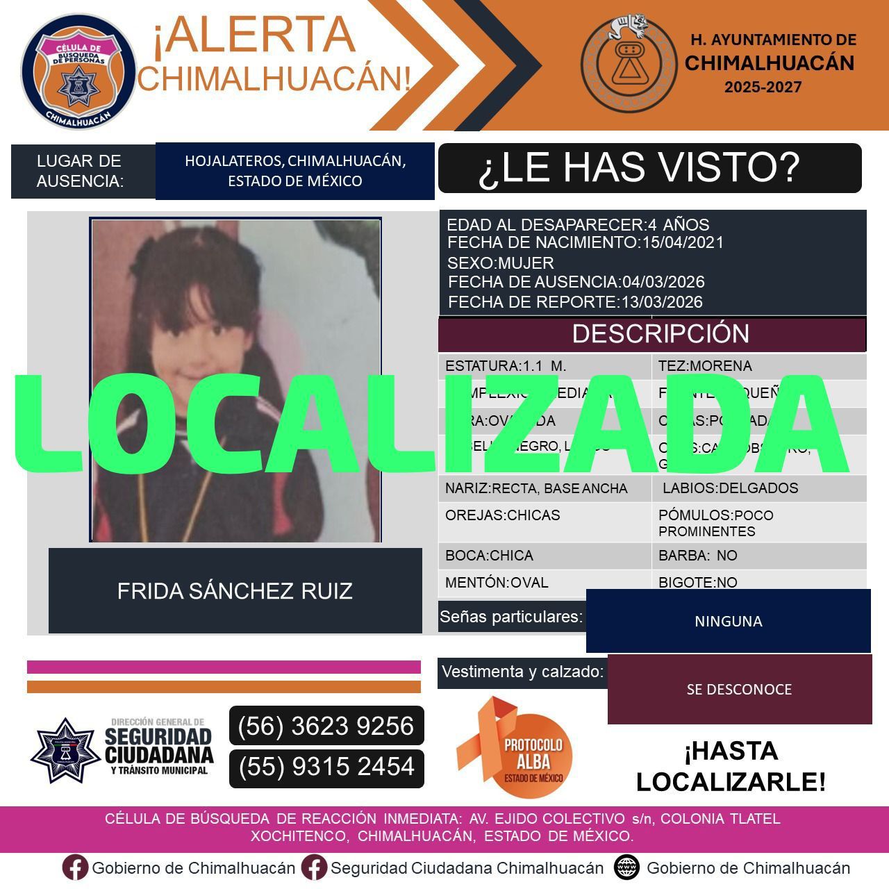 Chimalhuacán, México._El gobierno de Chimalhuacán, a través de la Célula de Búsqueda de Reacción Inmediata de la Dirección General de Seguridad Ciudadana y Tránsito Municipal, en coordinación con la Policía de Género, informó la localización con vida de Diana Laura Ruiz Martínez y sus hijas, Frida y Regina Sánchez Ruiz, de 4 y 7 años de edad, respectivamente.