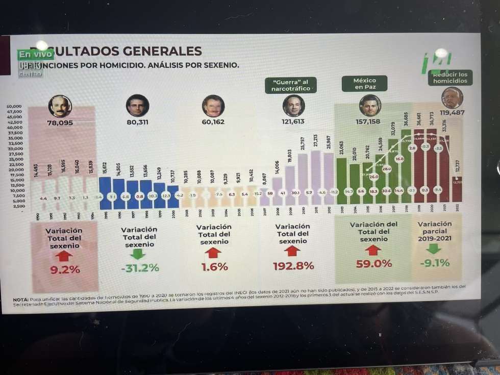 Muestra López Obrador la gráfica del INEGI sobre la cantidad de homicidios por sexenio.