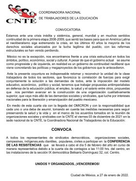 Este 5 de febrero se llevará a cabo la ’Conferencia de las resistencias’ en la sede nacional de la CNTE que se ubica en el edificio de la sección 9 en Belisario Domínguez no. 32 del Centro Histórico.