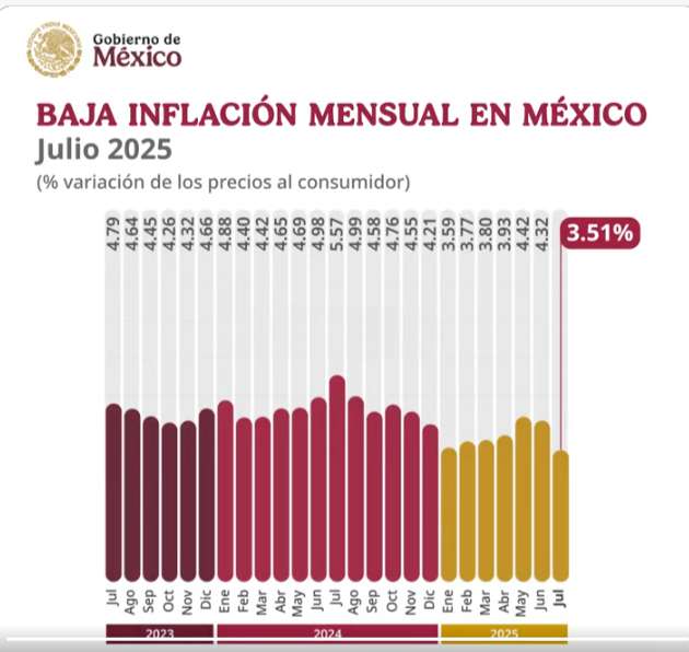 Presentó una gráfica con datos recientes que muestran que la inflación general disminuyó del 4.42 por ciento en mayo, el nivel más alto del año, al 4.32 en junio y luego se redujo a 3.51 en julio.